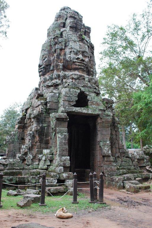 本殿の周囲の尖塔には、優しげな観世音菩薩の顔が彫られている。