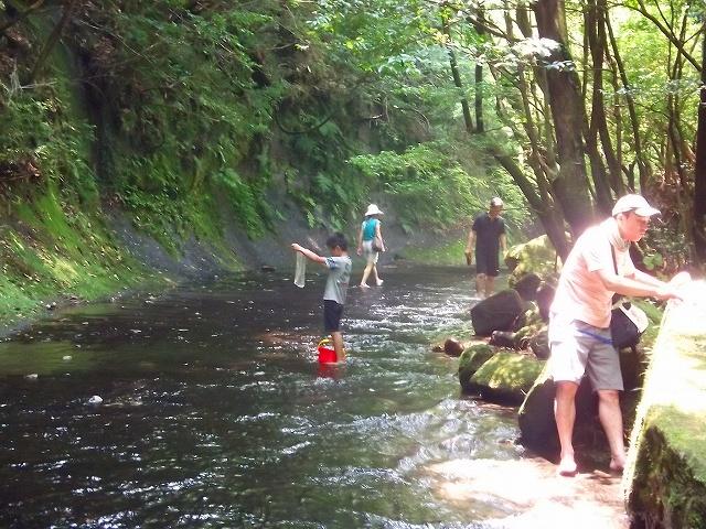 この一枚岩の川は水深が10~20センチ程度で、水の流れで底がなめらかになっています。子供に水遊びさせても怪我の心配がなく安心です。この時期は水遊びができるあまり人に教えたくないほどの涼空間です。