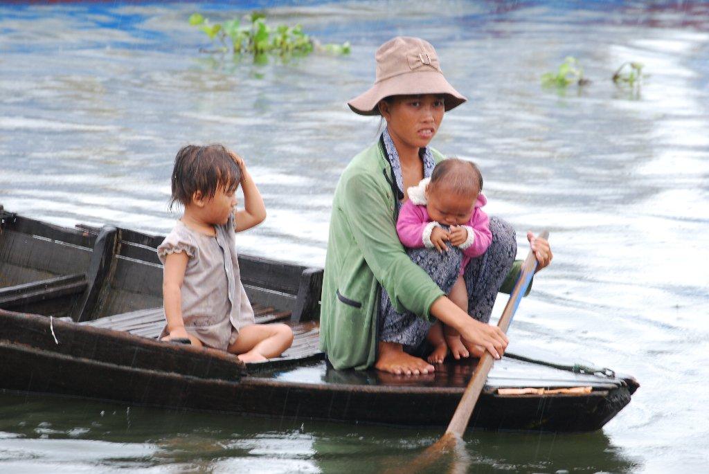 降りしきる雨の中、小舟をこぐ母親。