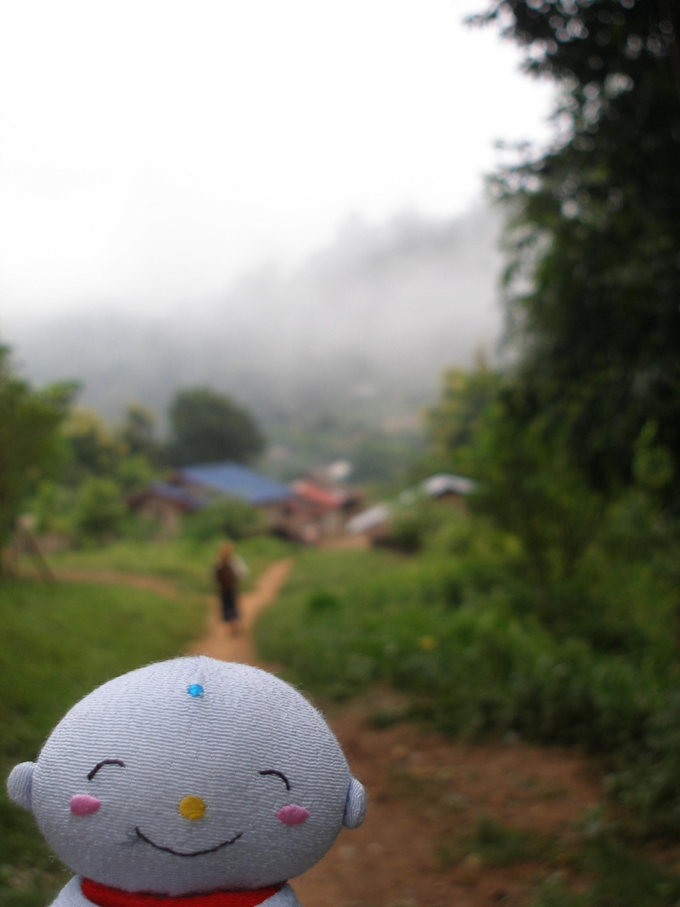 いつもはモン族の家にホームステェイしているそうだが今日はその家に親戚が来ていて泊まれないので急遽,カム族のある家に泊まることにかわったようだ。青い屋根の家が今日ホームステェイさせていただく家。