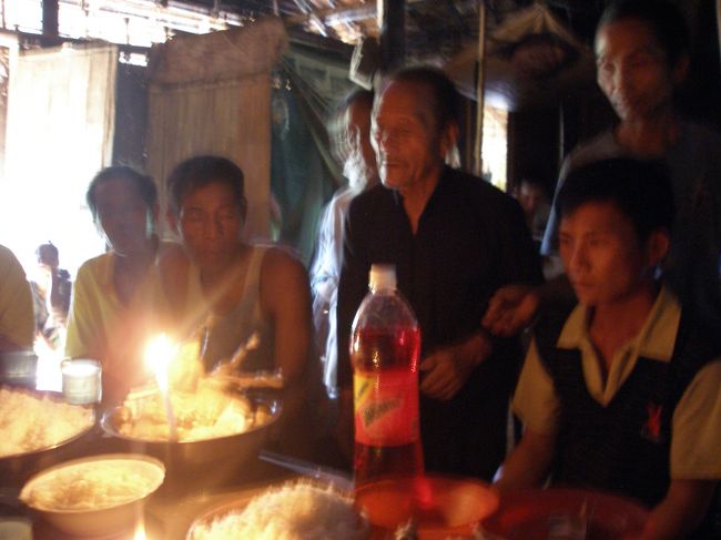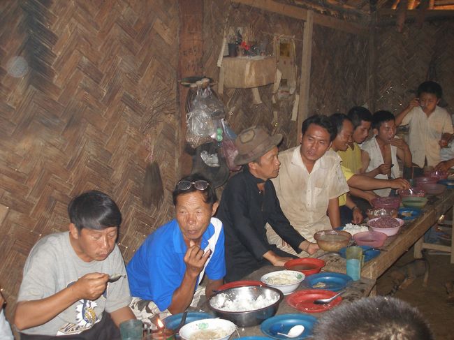 食事が開始される。最初ラオラオというのどが焼けるように濃いラオスの焼酎を飲まされたが,あまり酒を飲まない?モン族だからか、すぐにジュースが行き交いするようになった。