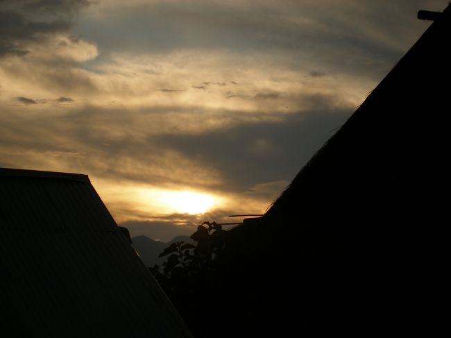 8月27日朝,家の中が真っ暗のうちから鶏の鳴き声で目が覚める。近く,家の中あたりで鳴いているのは昨日待ちで飼って来た鶏なのかなあなど考えていると再びうたた寝。6時頃 起きて外に出てみると家の中は真っ暗だが外は薄明るくなっていた。お父さん、お母さん達は起きて何やかやとやっている。