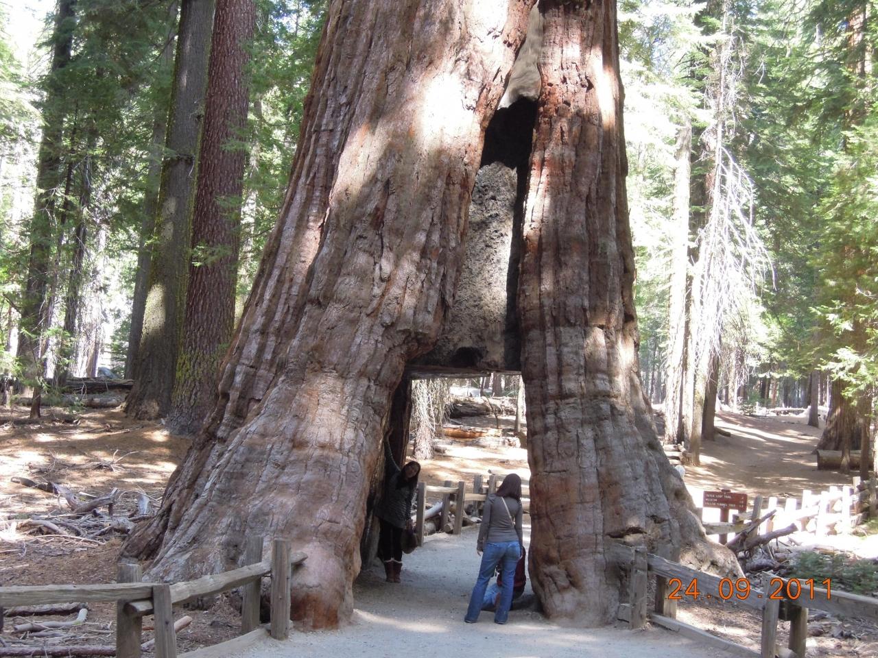 「california tunnel tree」です。これは火災でこうなった訳ではなく馬車が通れるようにと人がトンネルのようにわざとくりぬいたそうです。もう1本くりぬいた木があったそうですが、弱まり倒れてしまい今ではこの1本だけになったそうです。中をくぐる事が出来ます