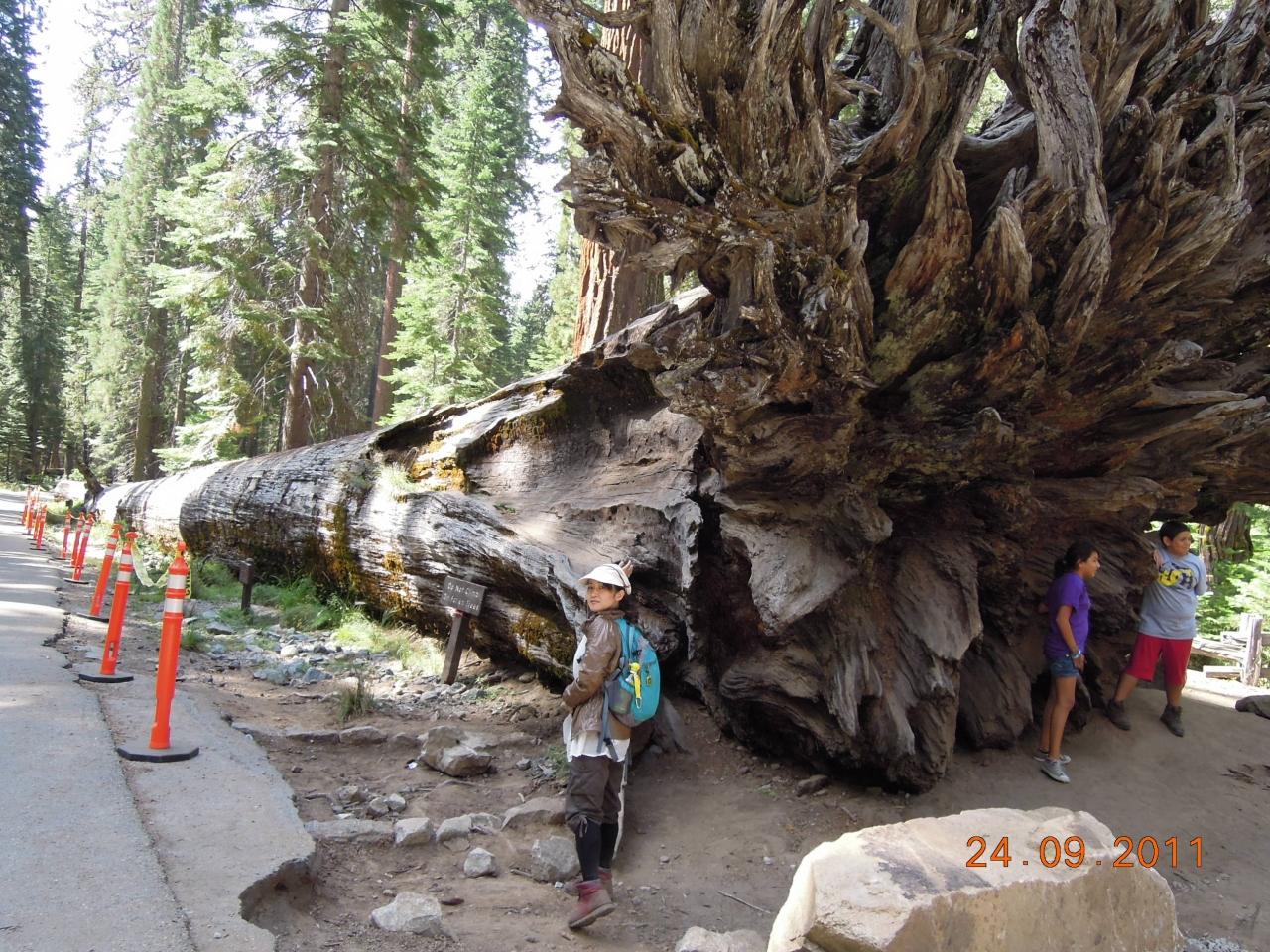 入り口付近に戻ってきました「フォーレンモナーク」という倒れた倒木です。数百年。この場に倒れているらしです。このセコイアは菌やバクテリアを抑制するため、倒れても腐らず、何百年もその姿をとどめているそうです。木の大きさに比して、根はとても浅くほとんどが地表2mまでだそうです。