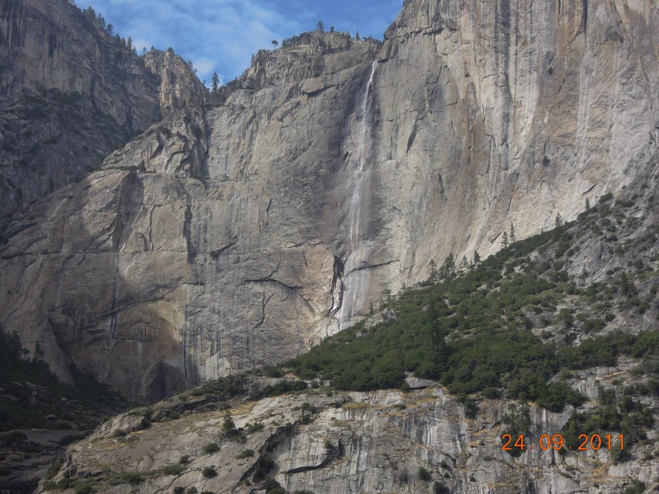 ヨセミテ滝です。本当は水量がおおい滝ですが、夏から少なくなり、秋にはかれてしまうとの事ですが、細いですが滝が見えます。昨日の豪雨のせいでしょうか??そのためか昨日もヨセミテ滝周辺はすごい人でした