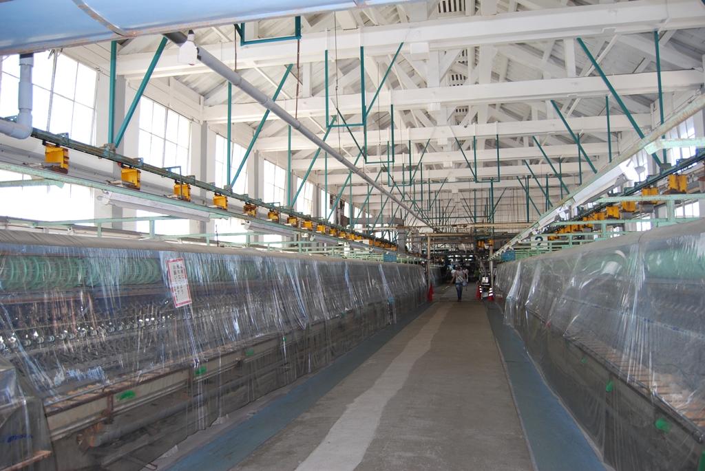 両脇に 最新式製糸器械が並ぶこの大空間を支えるのは、キングトラスと呼ばれた三角形で梁を引っ張り上げる構造だそうです(ガイドさんより) -
