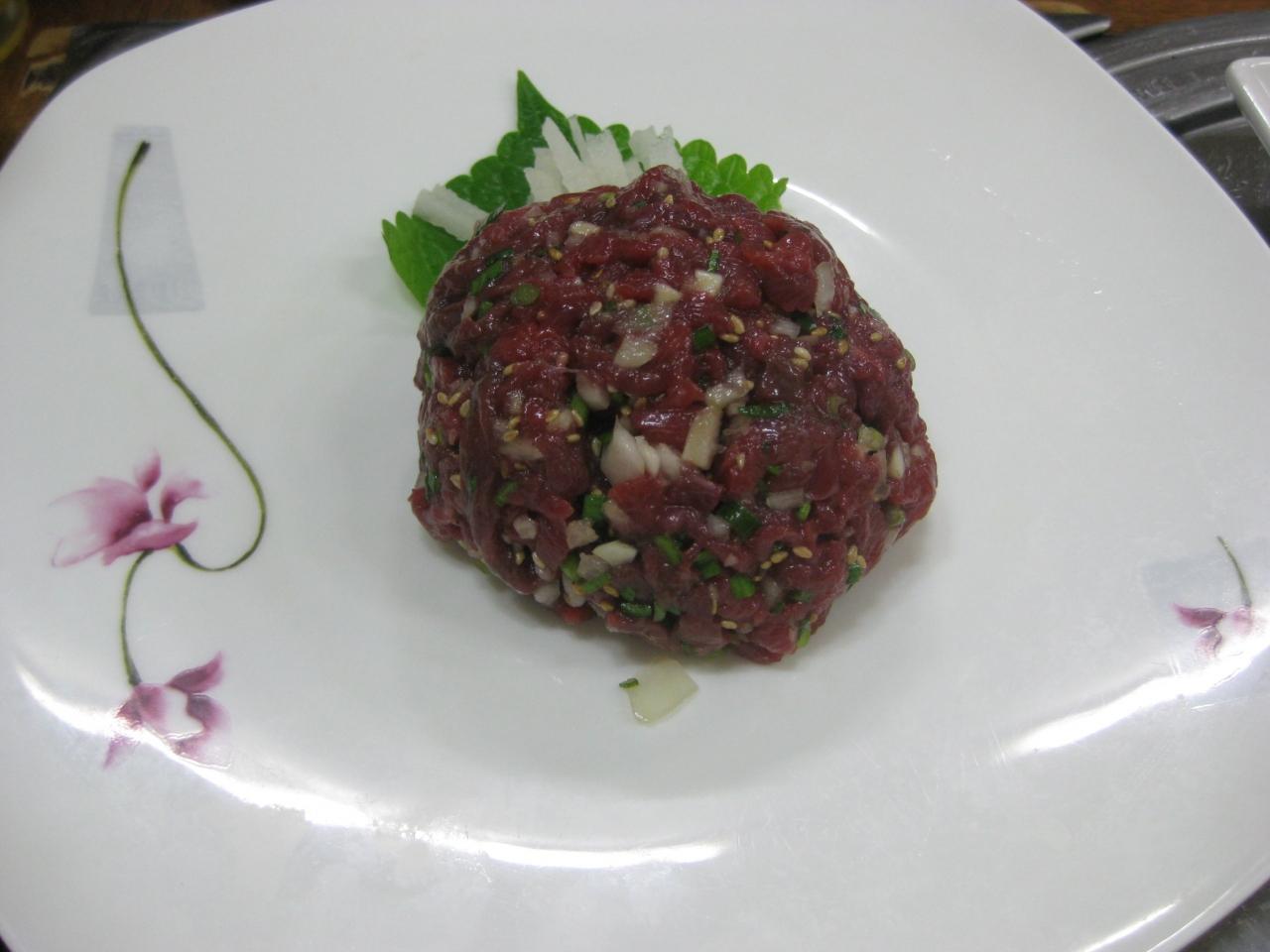 ユッケ。その後、お寿司や煮込み、馬刺し、ハンバーグなど。