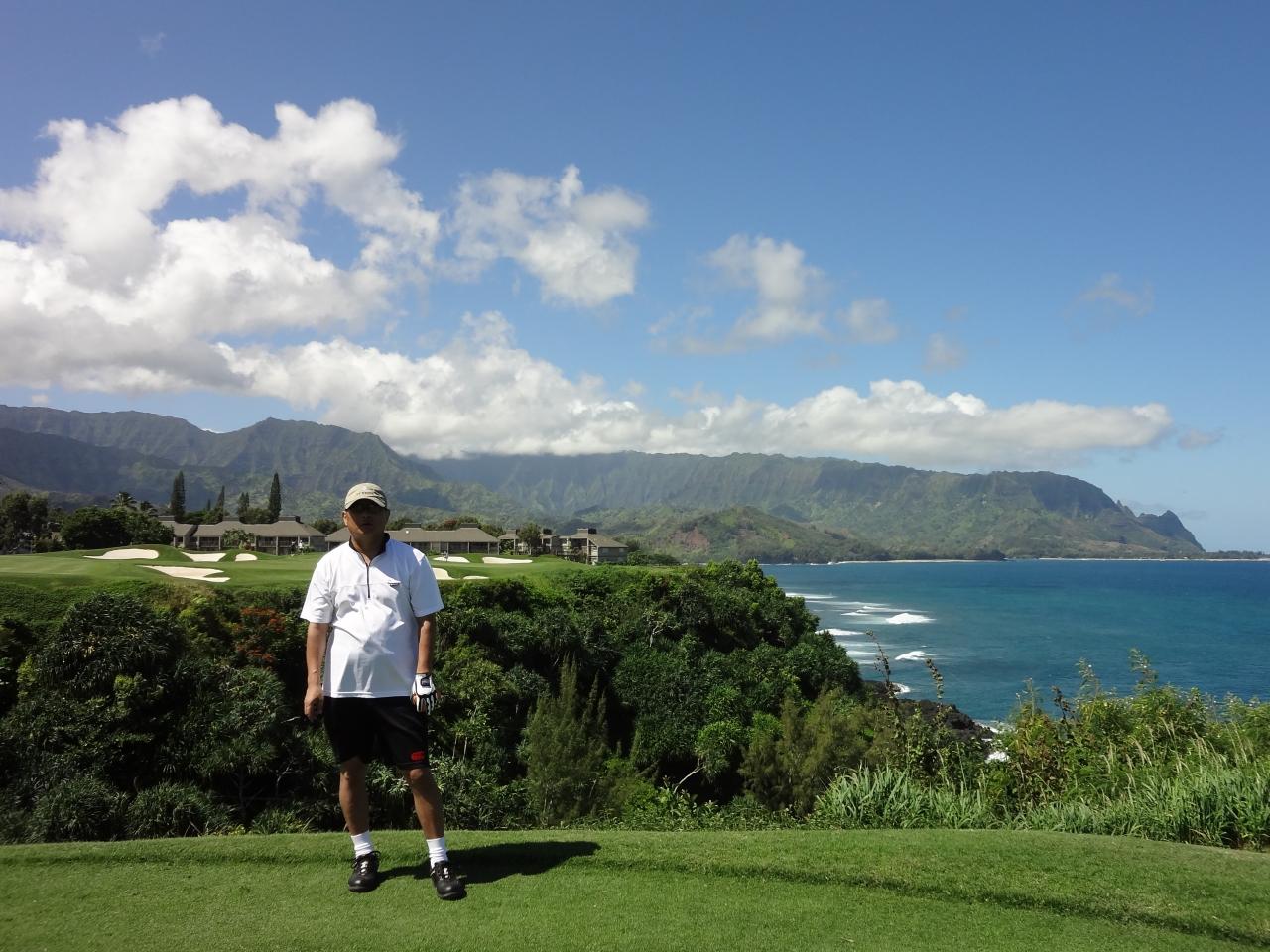 ジグネチャーホールの7番ホールです。海越えの眺望が素晴らしい崖を越える、腕を問われるティーからなり、みごとに3球カウアイ島にお土産になりました