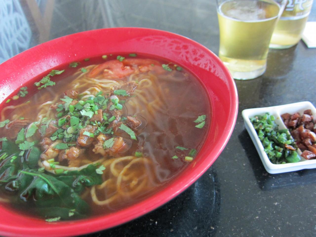 牛肉が入った麺を食べる