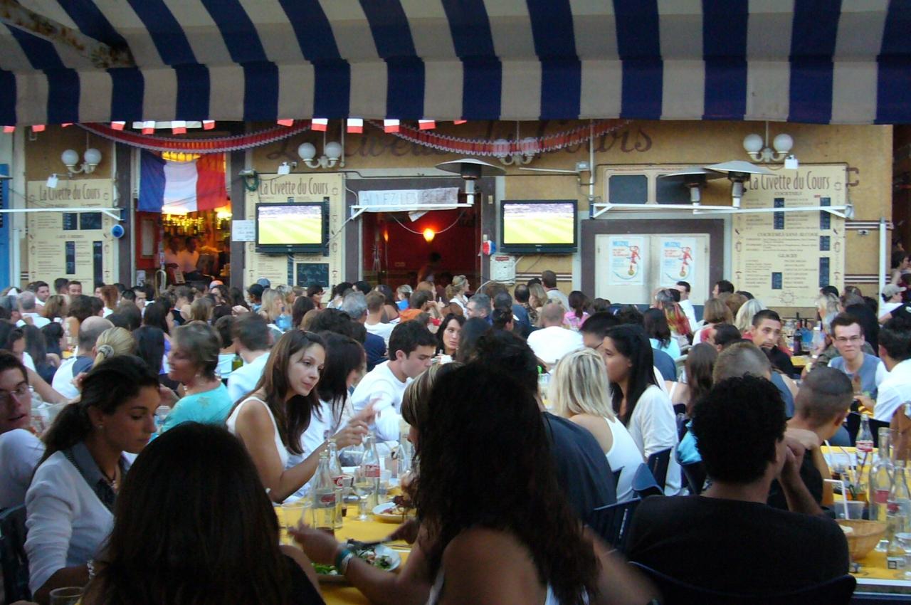 どのレストランも、カフェも、予約でいっぱい。通りにまでイスとテーブルを出して、外にみんなで見るためのテレビが備え付けられていて。