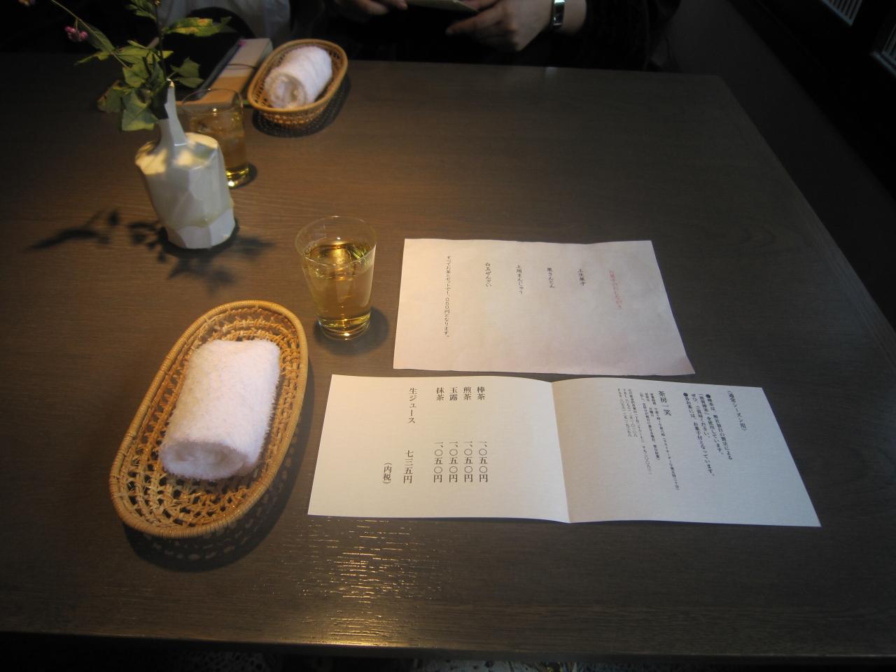 席に着くと冷たい棒茶がでてきました。 -