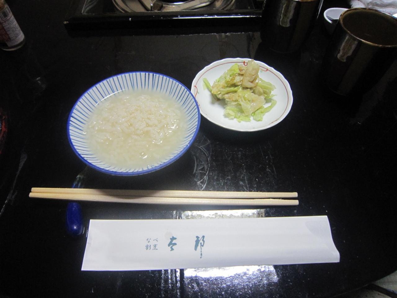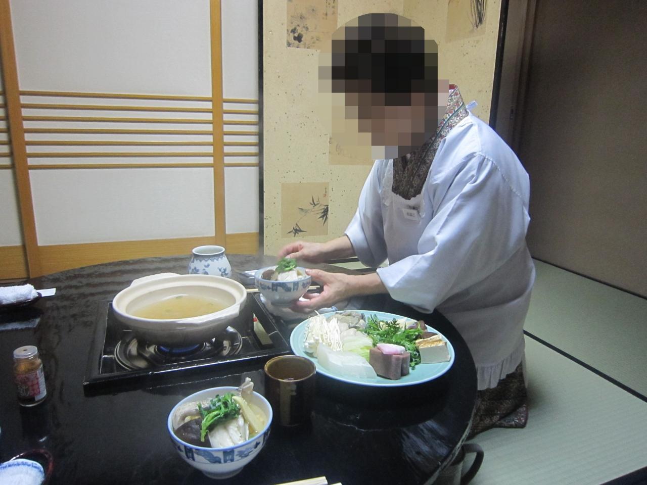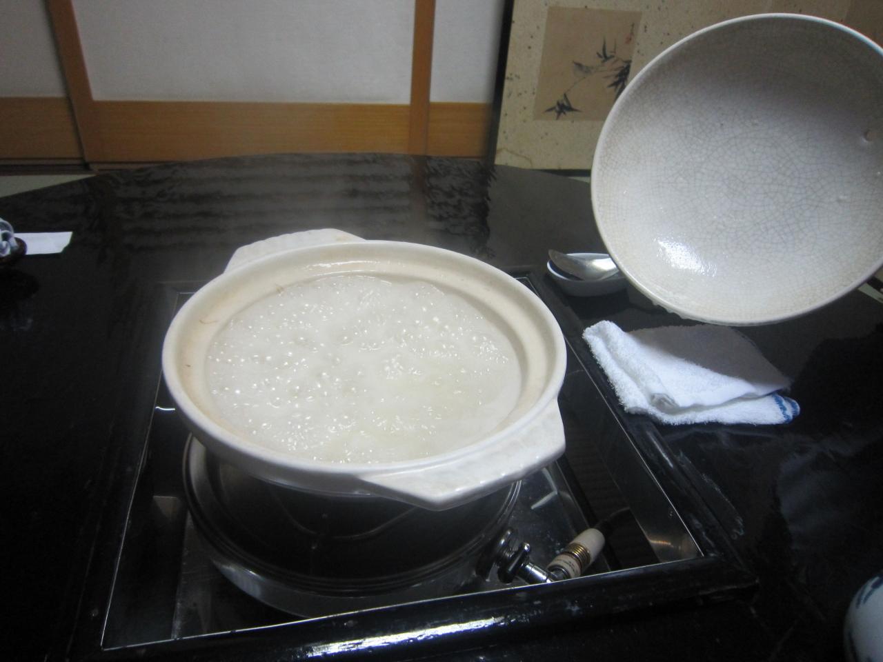 雑炊をよそった後、仲居さんは席をはずして残りの雑炊は自分たちでよそいます。 -
