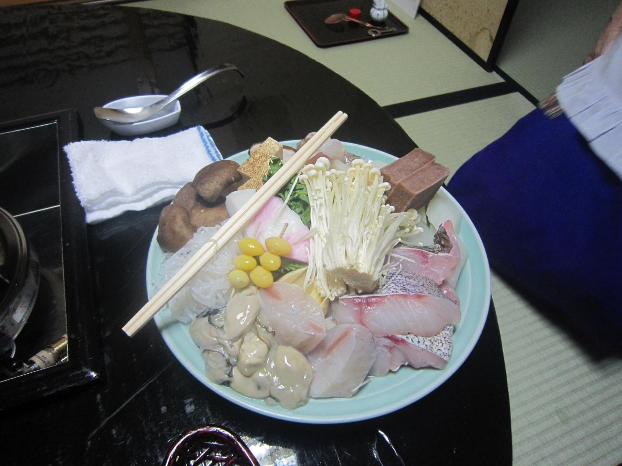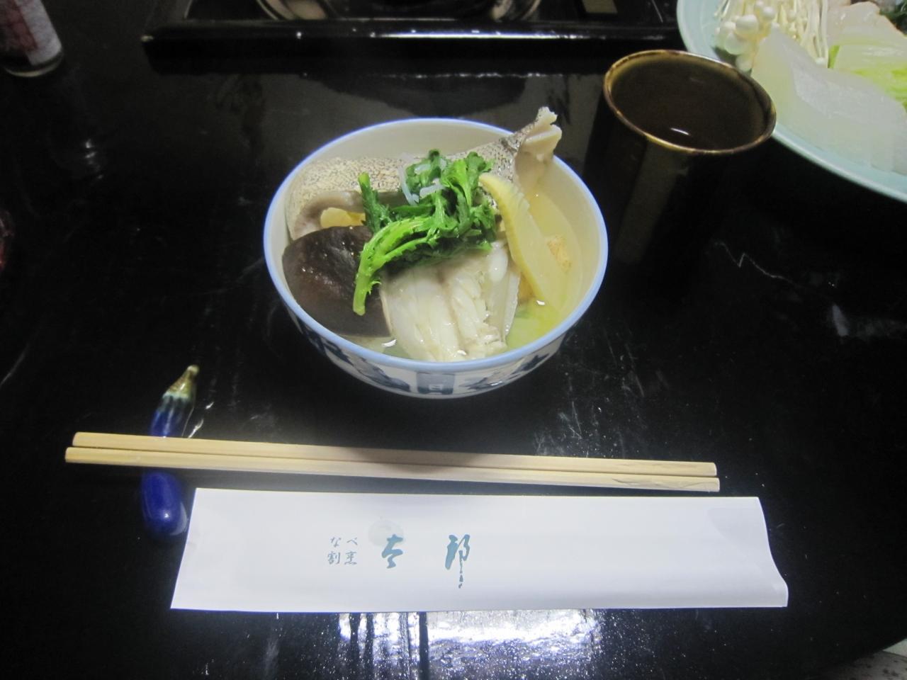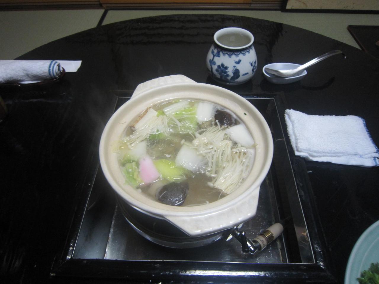 雑炊をよそった後、仲居さんは席をはずして残りの雑炊は自分たちでよそいます。 -