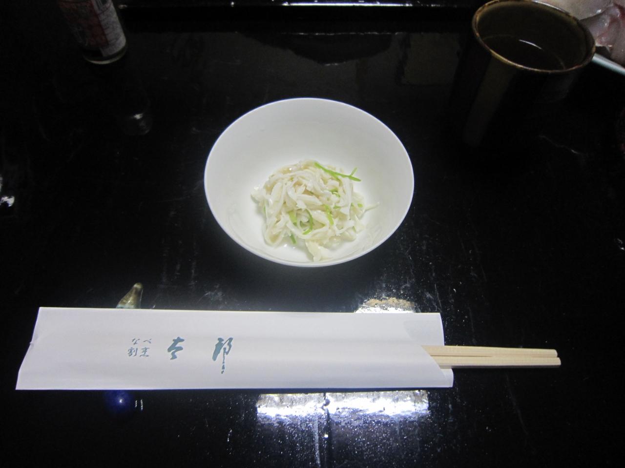 付き出し。イカの燻製のような感じの酢のものです。 -