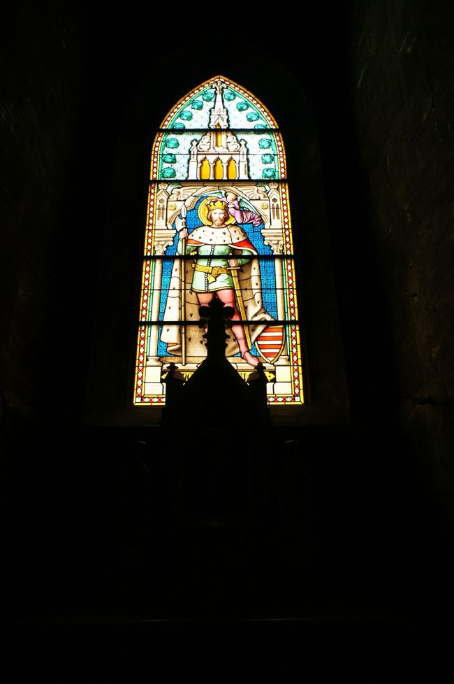 同じくベンツール・ジュラ作の絵画『聖処女マリアに王冠を差し出す聖イシュトヴァーン』をもとに製作されたステンドグラスの窓。