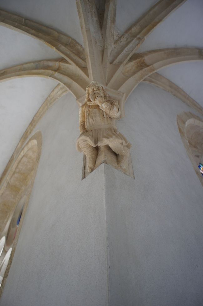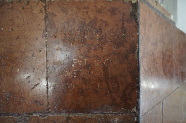 回廊の完成年号である1486年が刻まれている角のアーチの迫り元。
