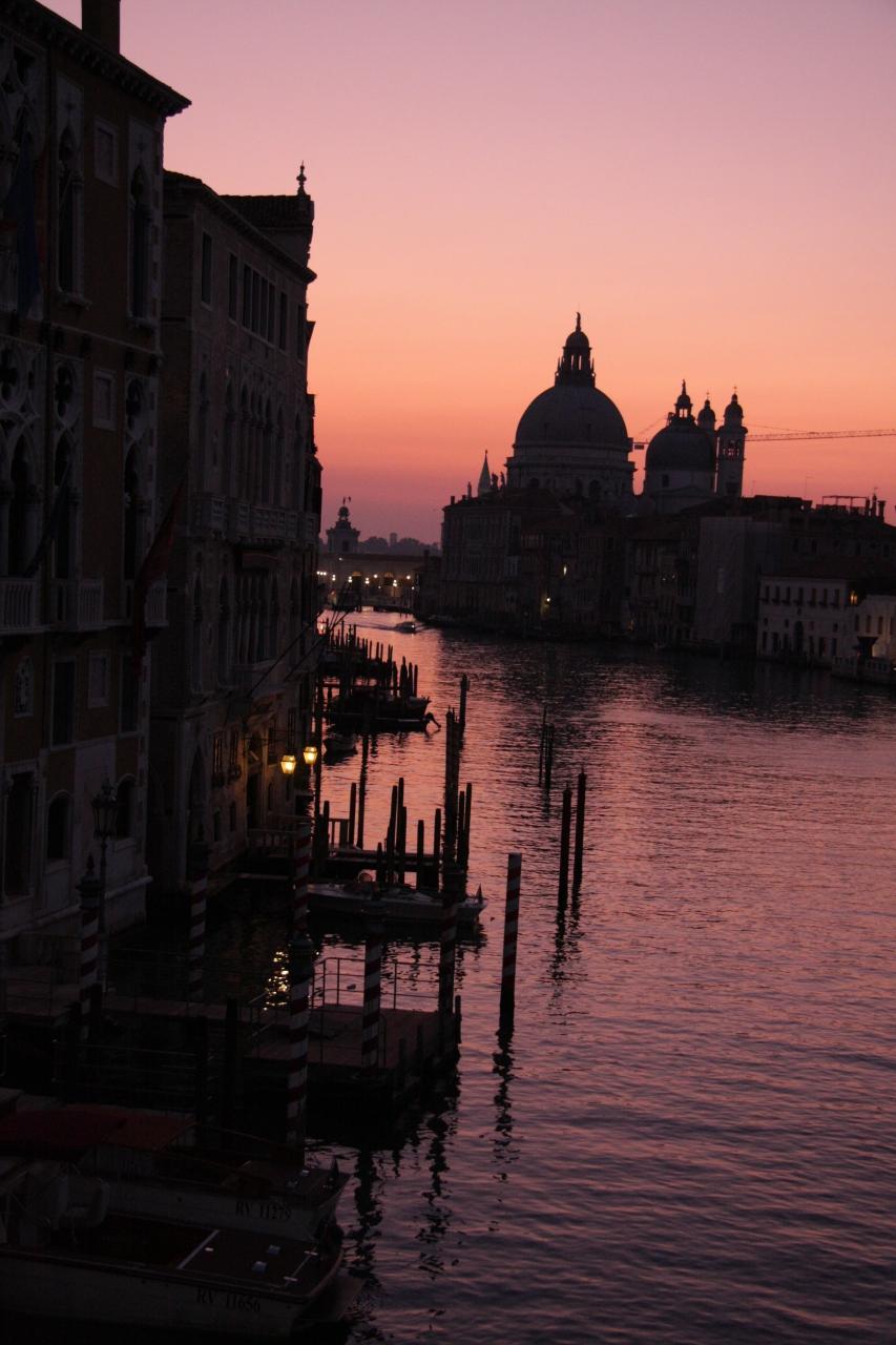 アカデミア橋の上に出て空の色に感動し、東に見えるドーム教会(サンタ・マリア・デッラ・サルーテ教会)や運河を行き交う小船などの夜明け前の風景をわくわくしながら何枚も写した。