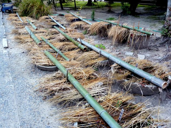 唐招提寺の回遊を終え、一休みした売店の裏で、干しわらくさで覆い育成している蓮の鉢が並んでいた。