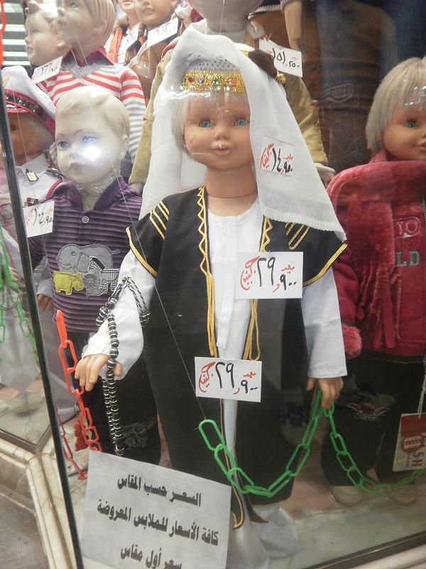 頭は長方形の白い切れを 不規則に折り 頭にかぶり