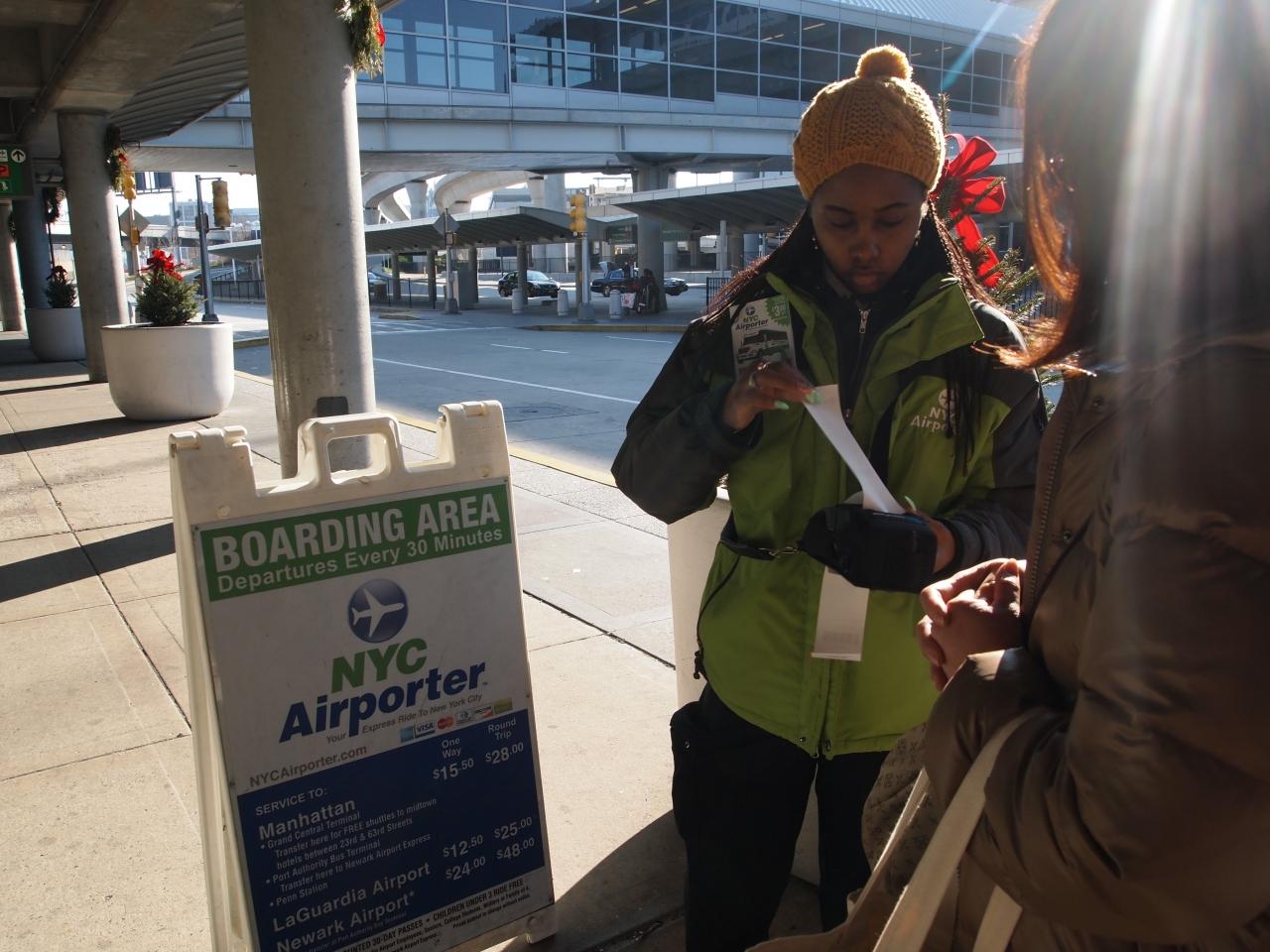 今回ツアーではなかったので、マンハッタンまでの移動はいろいろ下調べしてNYCポーターにお願いすることになりました。空港を出たら写真のようなジャンパーを着た人がいるのでチケットを購入します。往復$28 -