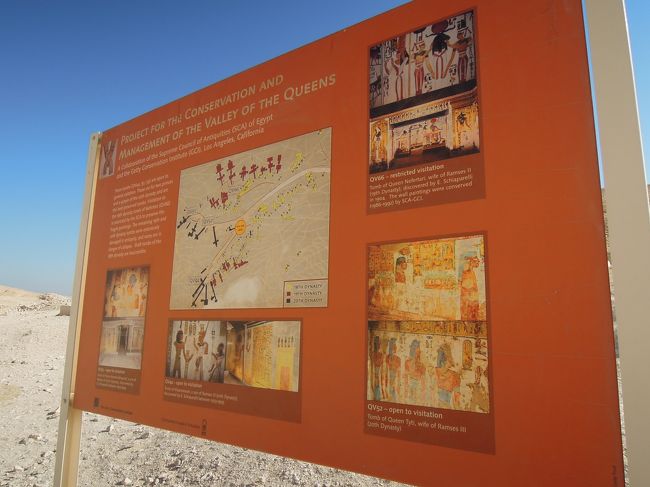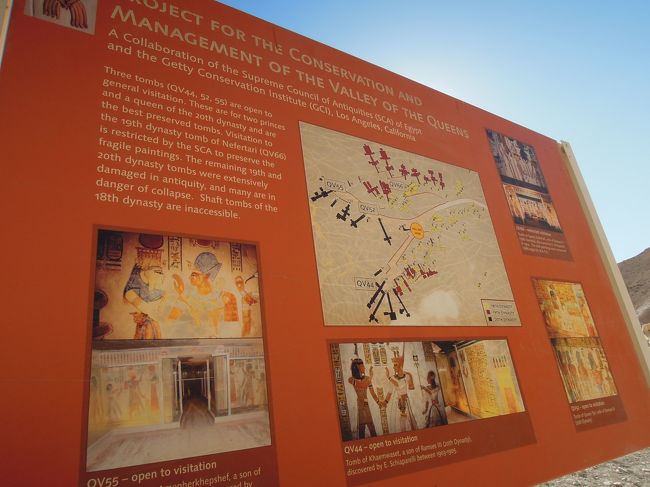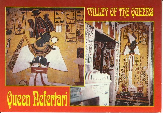 ネフェルタリの墓。建築王ラムセス?の王妃。壁画の美しさは西岸随一。1904年イタリアのスキアパレッリが発見。現在閉鎖中だが特別許可はOK。ガイド談としてネフェルタリ墓は「1人約1000ポンド×10人」で10000ポンド支払うと特別観覧許可されるとか。
