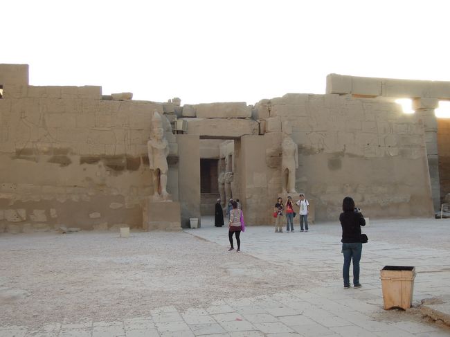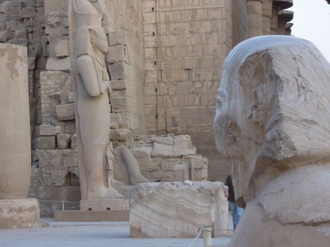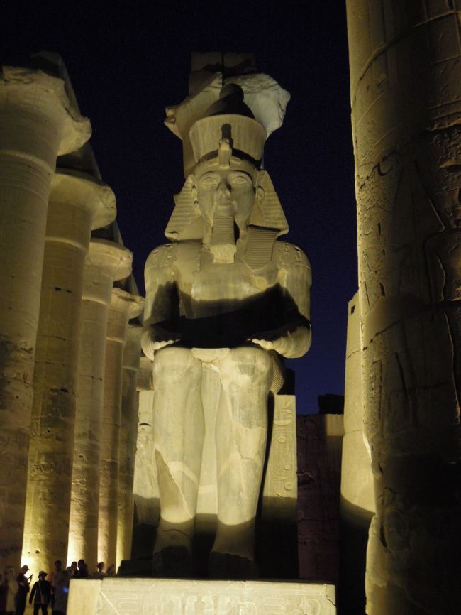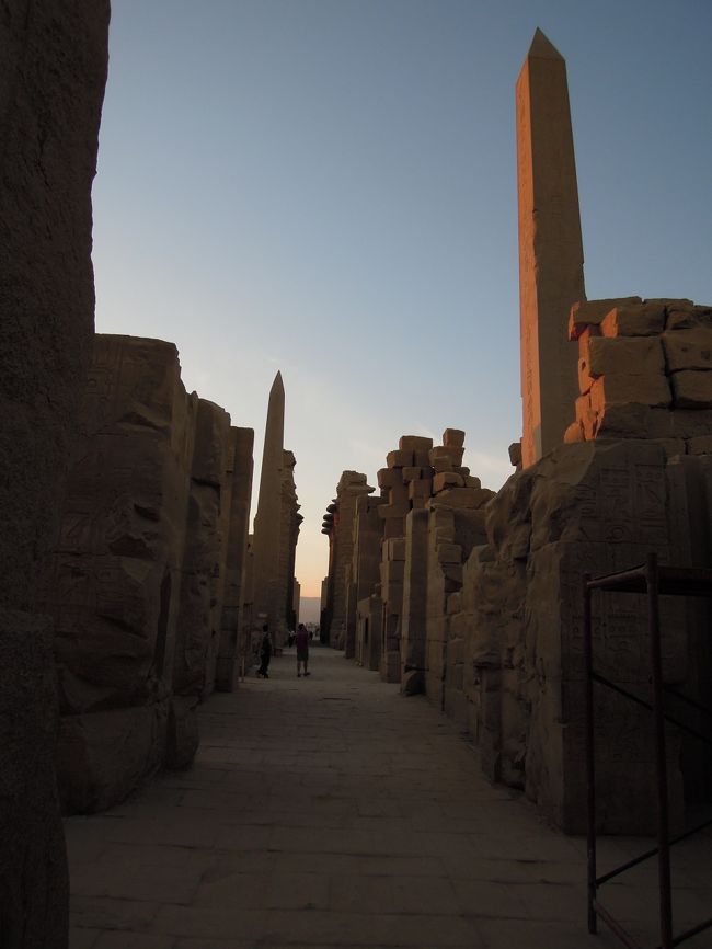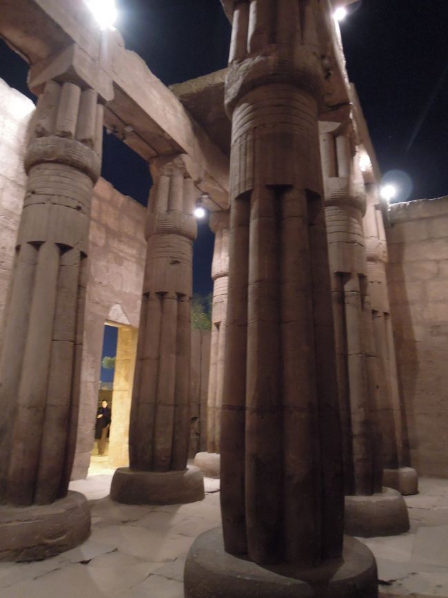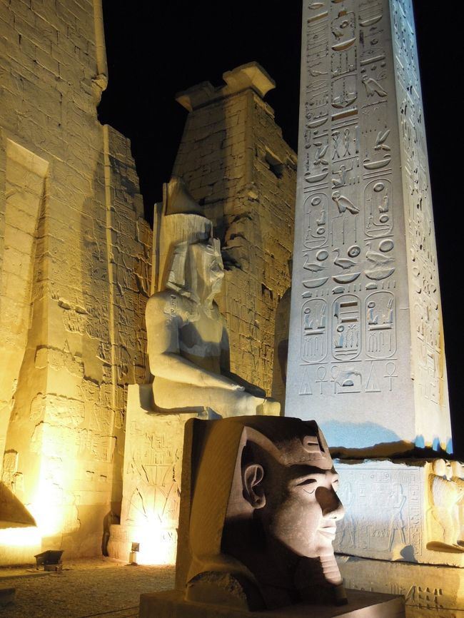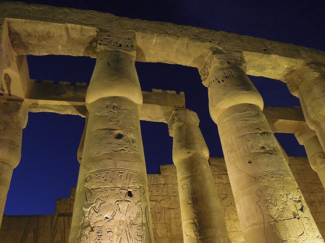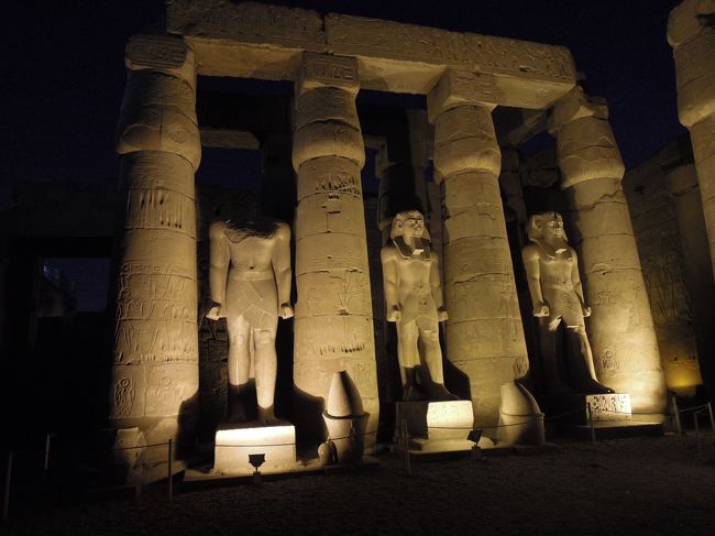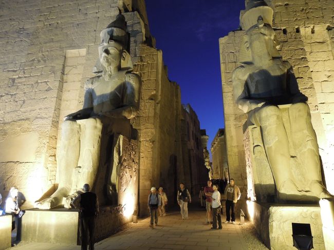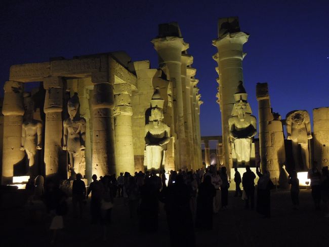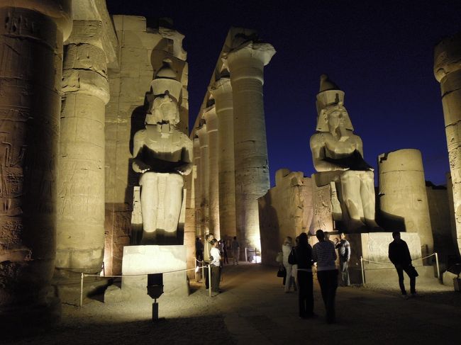 ルクソール神殿に移動したらライトアップされていた。カルナック神殿の副殿で参道、塔門、中庭、大列柱廊、列柱室、至聖所がバランスよく配置されている。途中主軸が10度ずれているが神殿の正面を太陽の昇る東側に向けるため。一時期アマルナに遷都して荒れたがツタンカーメンが修復、一部完成させた。祭り好きでオペト祭り(年1回カルナック神殿の金の神像をルクソール神殿に運んで大騒ぎをした)が有名。入場料50ポンド
