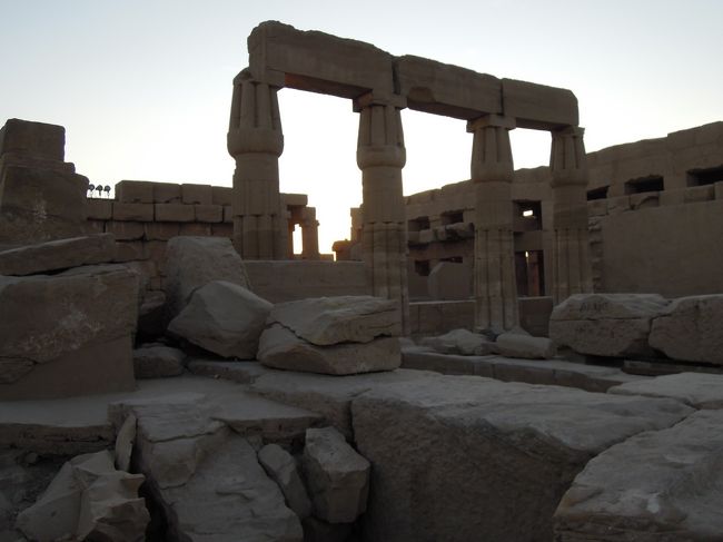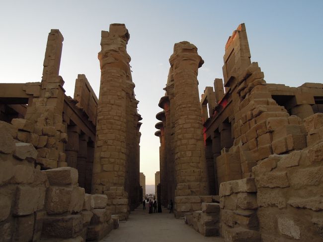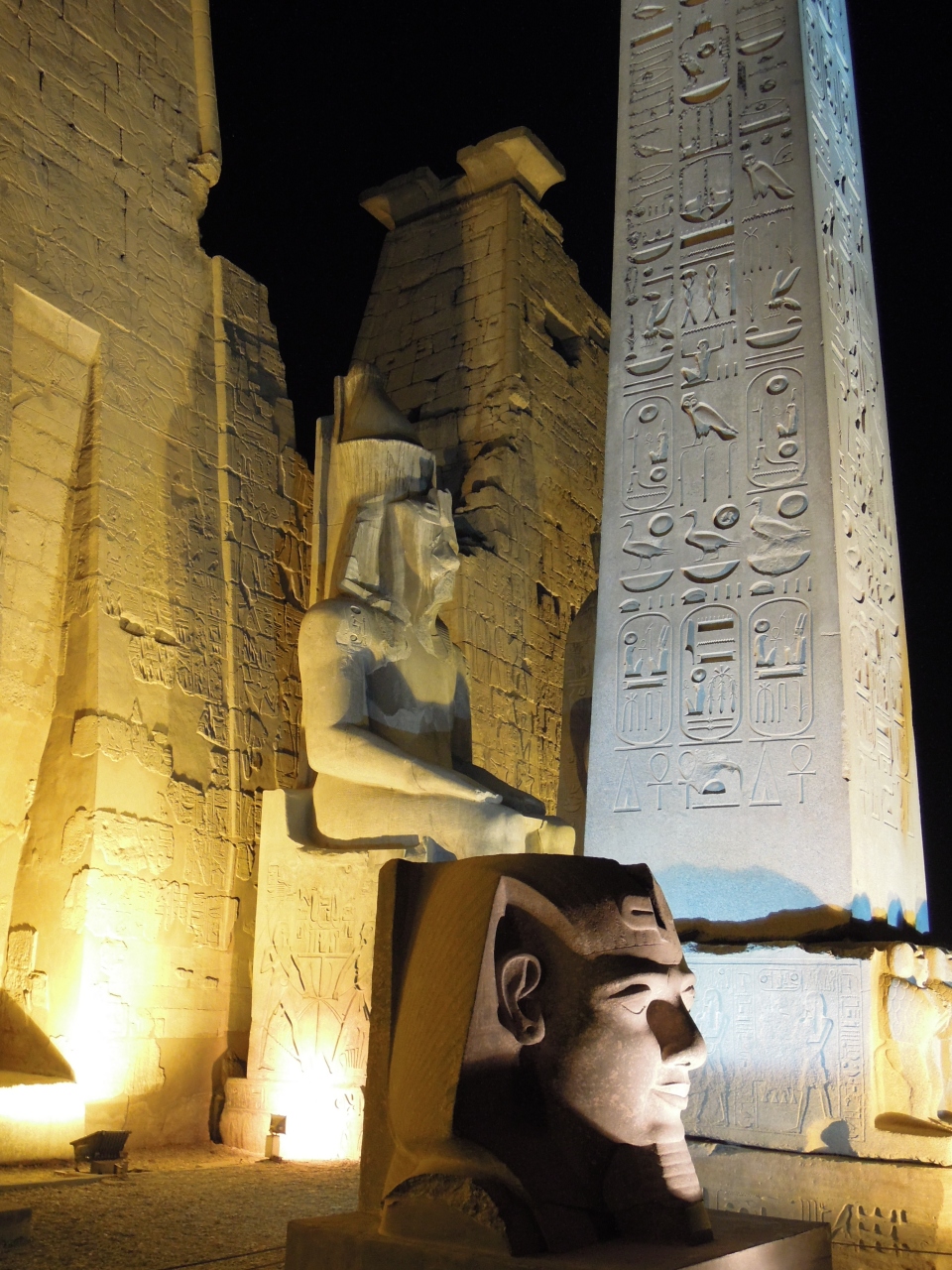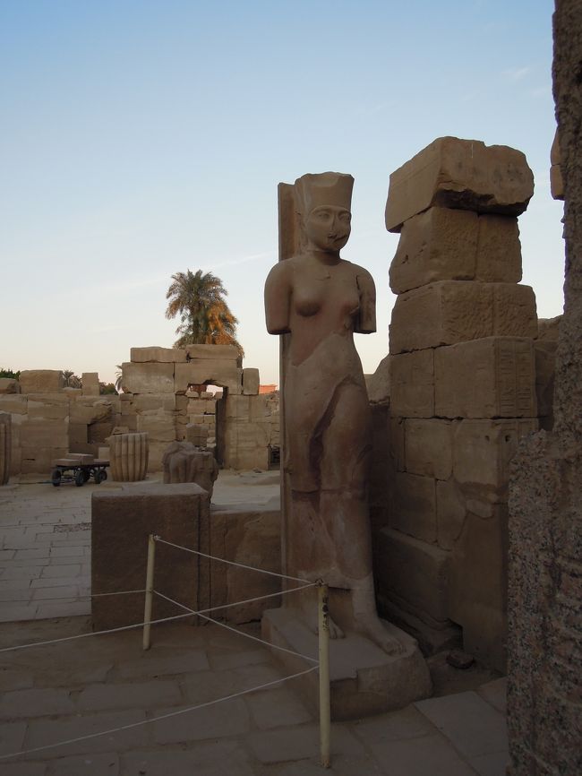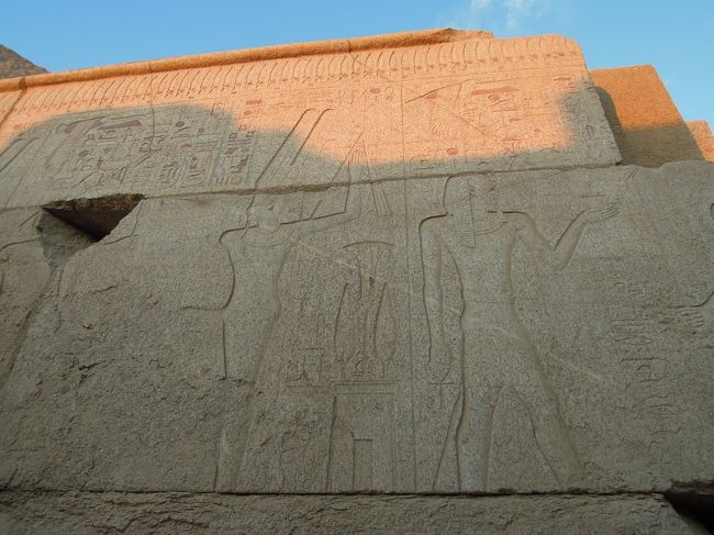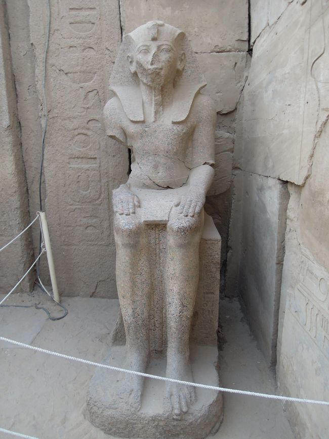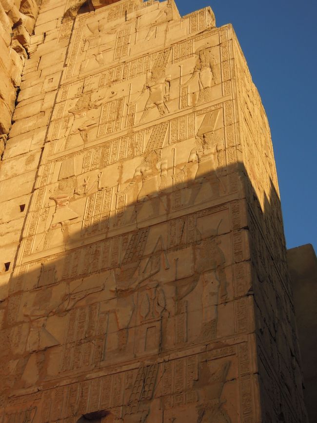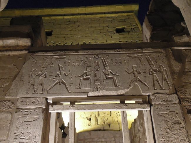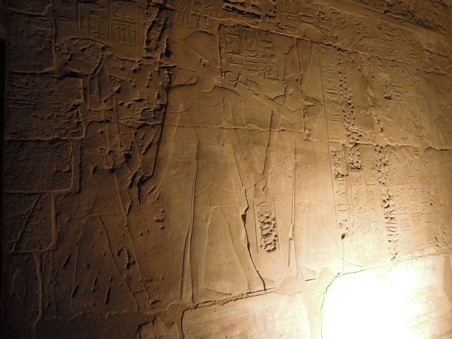 ルクソール神殿に移動したらライトアップされていた。カルナック神殿の副殿で参道、塔門、中庭、大列柱廊、列柱室、至聖所がバランスよく配置されている。途中主軸が10度ずれているが神殿の正面を太陽の昇る東側に向けるため。一時期アマルナに遷都して荒れたがツタンカーメンが修復、一部完成させた。祭り好きでオペト祭り(年1回カルナック神殿の金の神像をルクソール神殿に運んで大騒ぎをした)が有名。入場料50ポンド