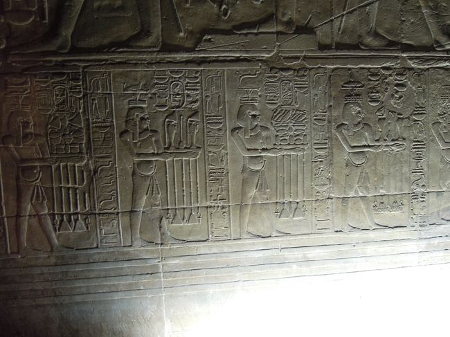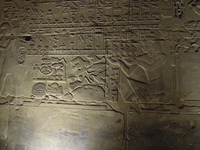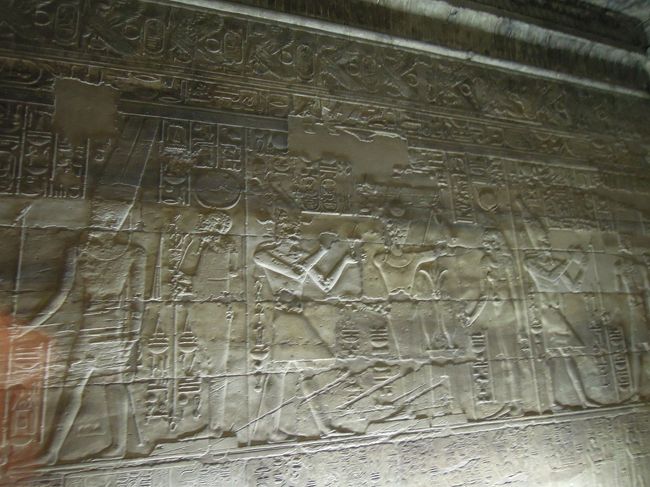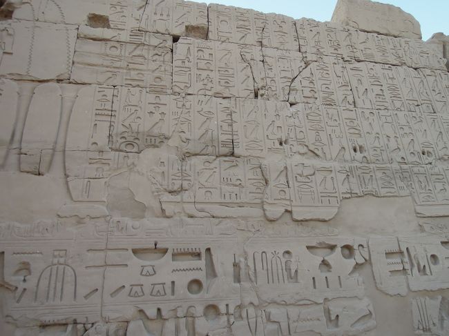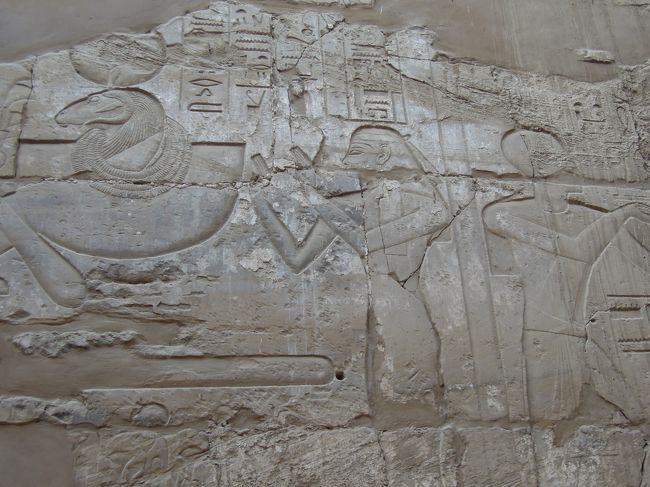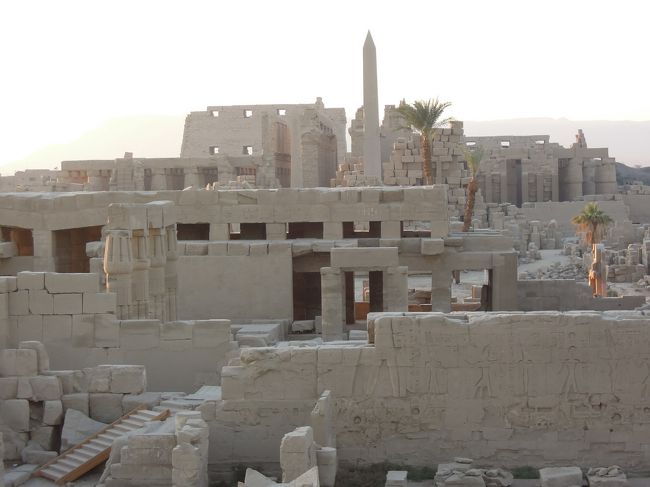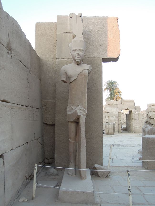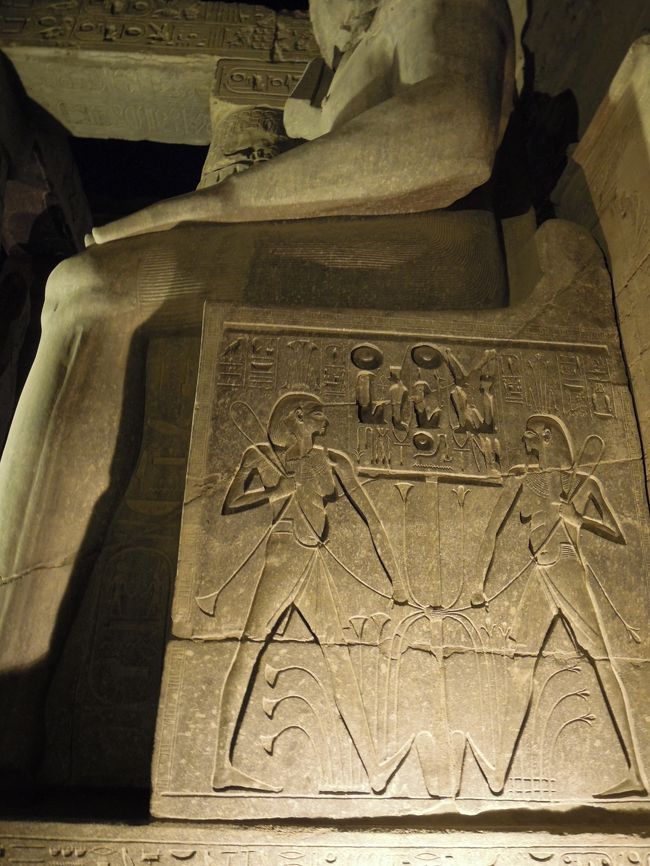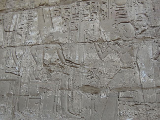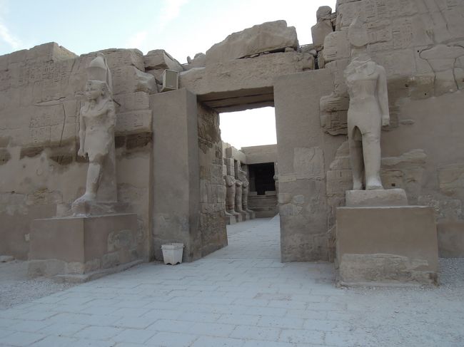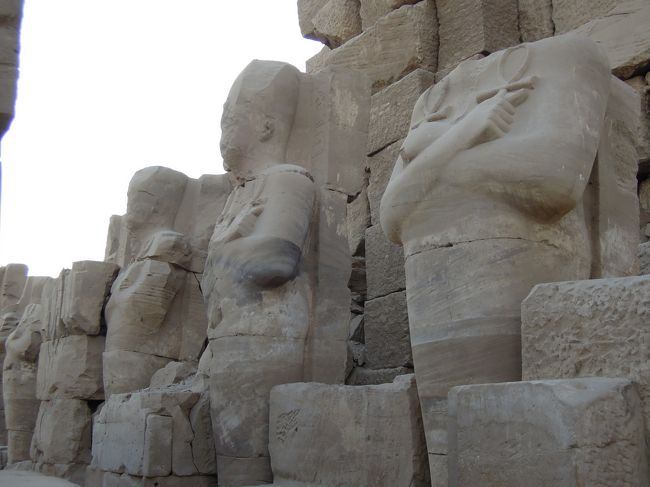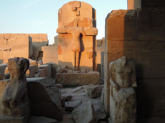 ルクソール神殿に移動したらライトアップされていた。カルナック神殿の副殿で参道、塔門、中庭、大列柱廊、列柱室、至聖所がバランスよく配置されている。途中主軸が10度ずれているが神殿の正面を太陽の昇る東側に向けるため。一時期アマルナに遷都して荒れたがツタンカーメンが修復、一部完成させた。祭り好きでオペト祭り(年1回カルナック神殿の金の神像をルクソール神殿に運んで大騒ぎをした)が有名。入場料50ポンド