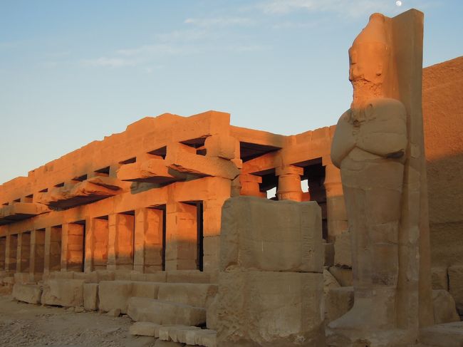 25mのオベリスクとラムセス?の座像の間に月が見えた