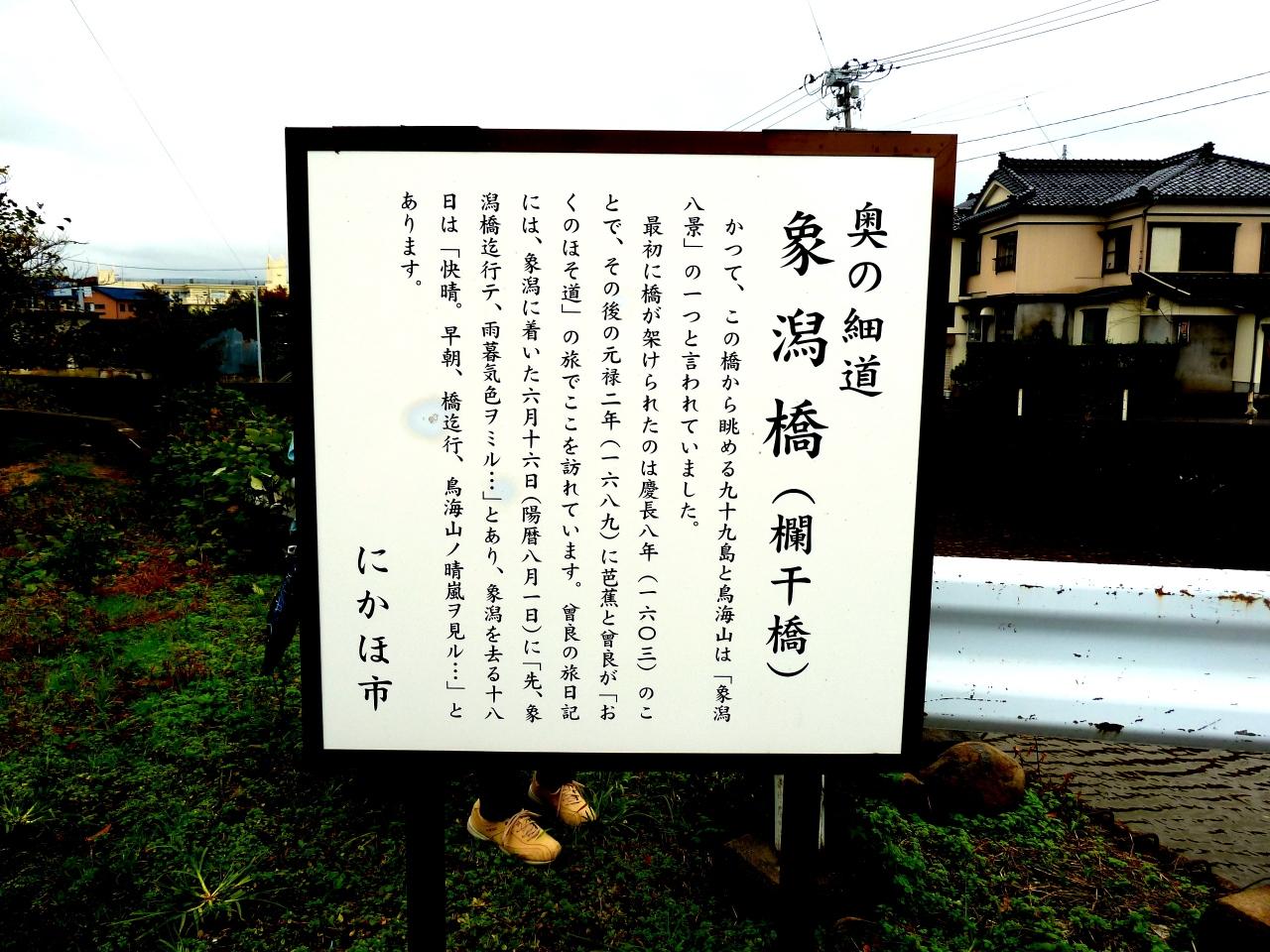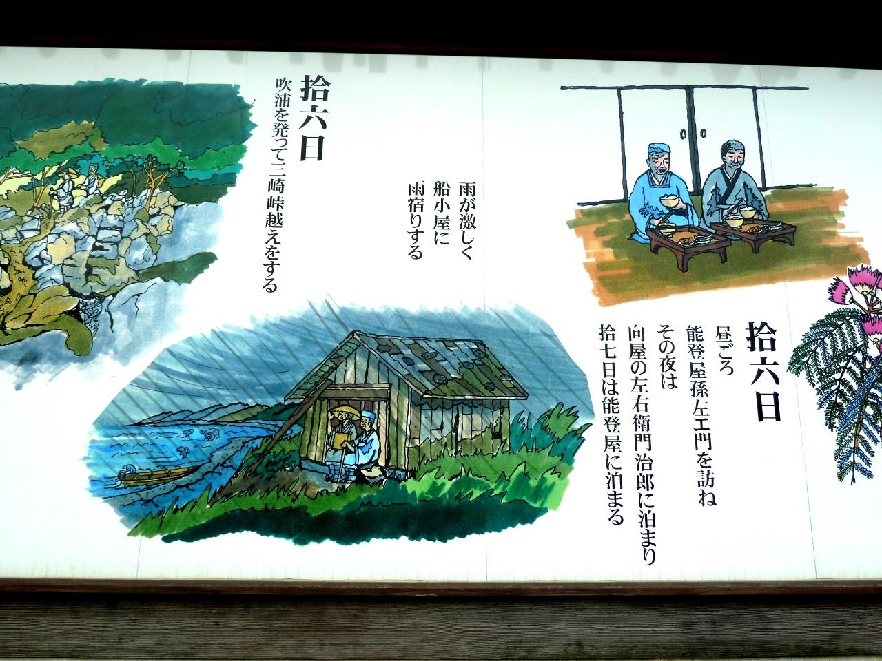 旅籠能登屋近くに、芭蕉の象潟での往来を紙芝居風にした大きな案内板が建っていた。