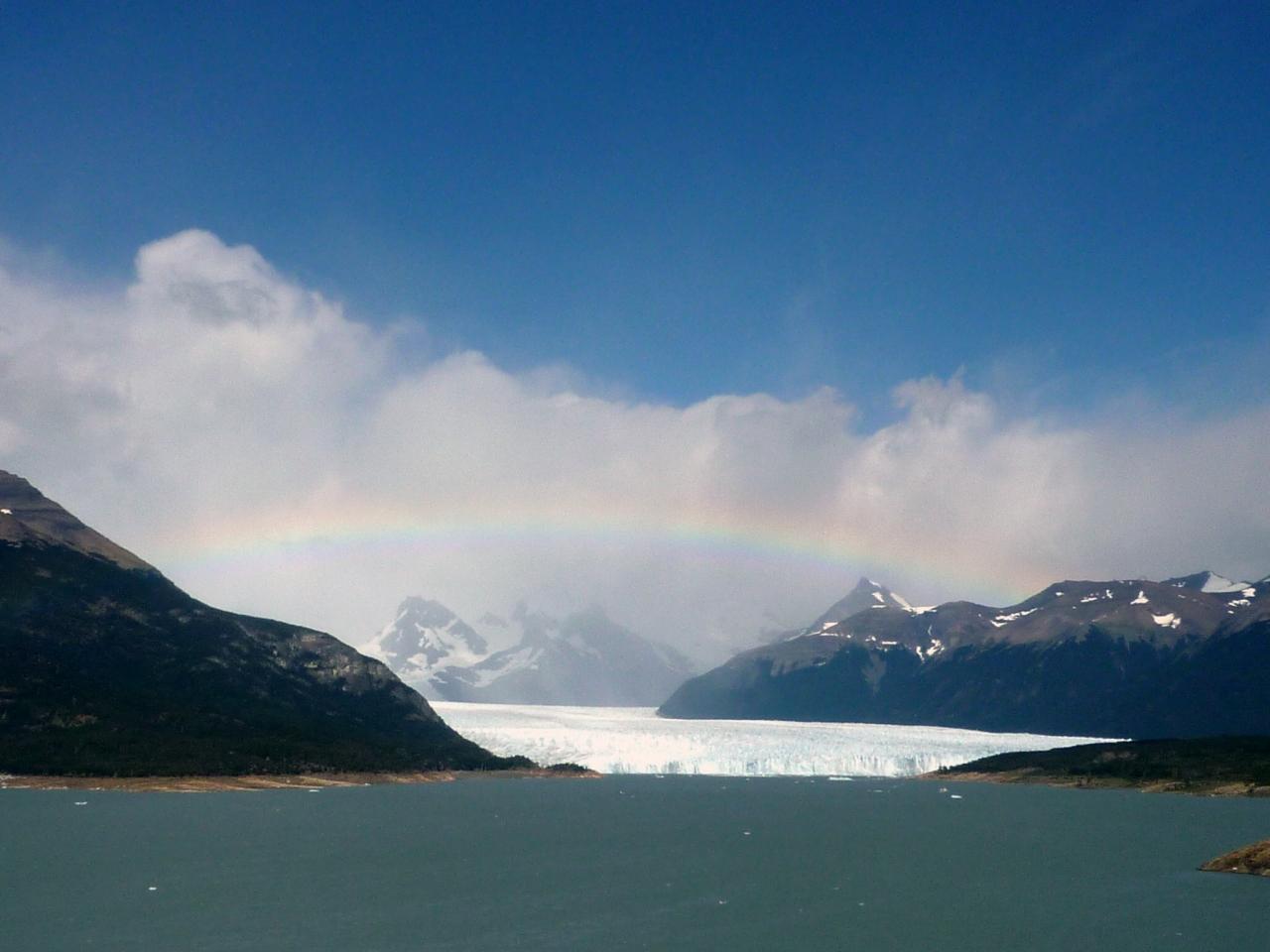今朝も晴れ。朝7時半のピックアップで、混載の大型バスで移動。途中アルヘンティーノ湖の見晴らしのよい場所に立ち寄った後、いよいよロス・グラシアレス国立公園内へ。トイレ休憩をはさんで、更に道を進むと、目の前にペリトモレノ氷河が現れる。なんと氷河に虹がかかっており、空も青くとてもきれいに見える。