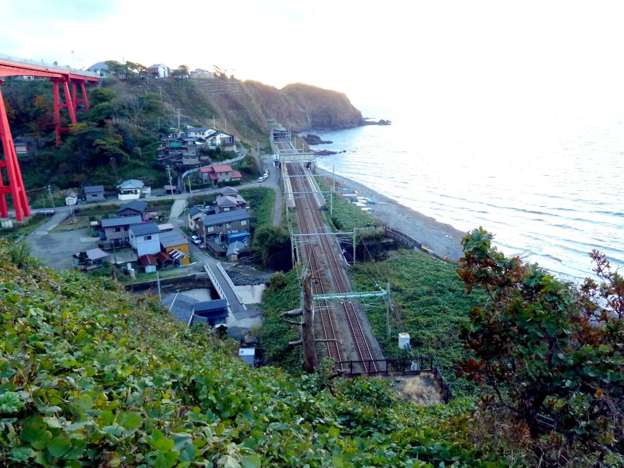 青海川駅の真下から広がる海と、弧を描くような断崖とその裾に浮かぶ岩礁群が、淡い夕日に照らされて輝き、思わず見惚れる。