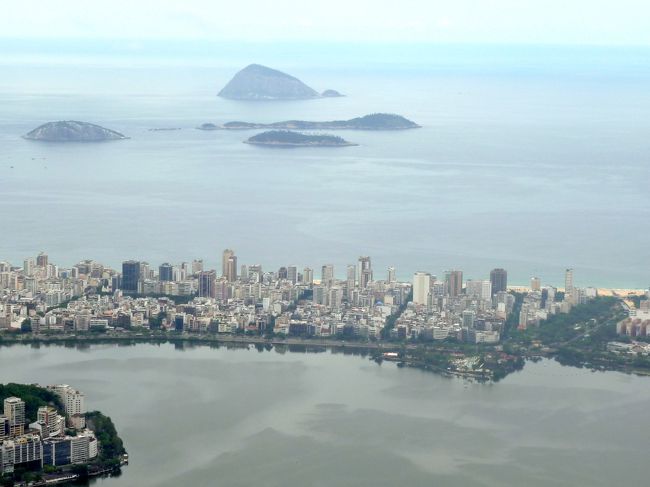 熱帯樹の茂みを越えると手前に海かと見紛うロドリコ・デ・フレイタス湖、その先にコバカパカーナ海岸が見える。
