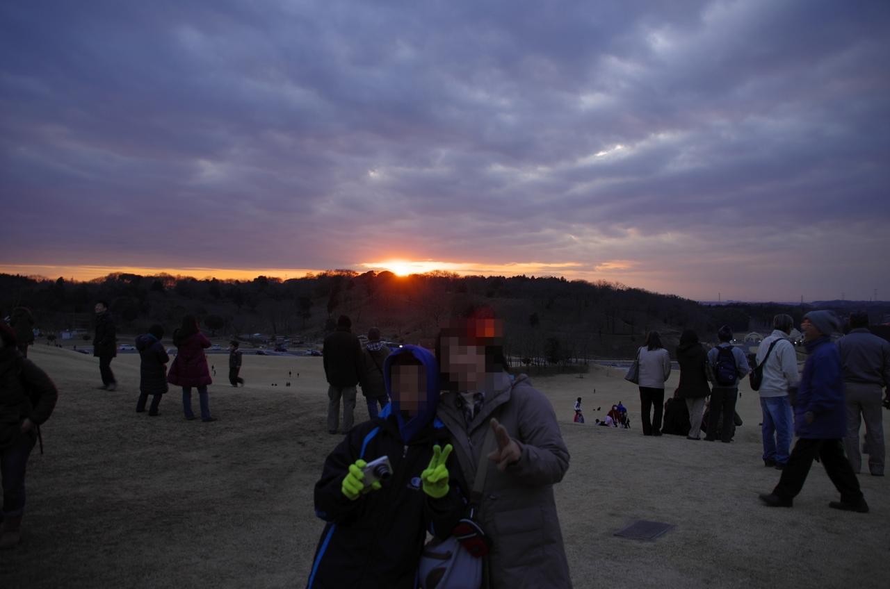 丘に集まり夕焼けに向かいカメラを構える人、眺める人。