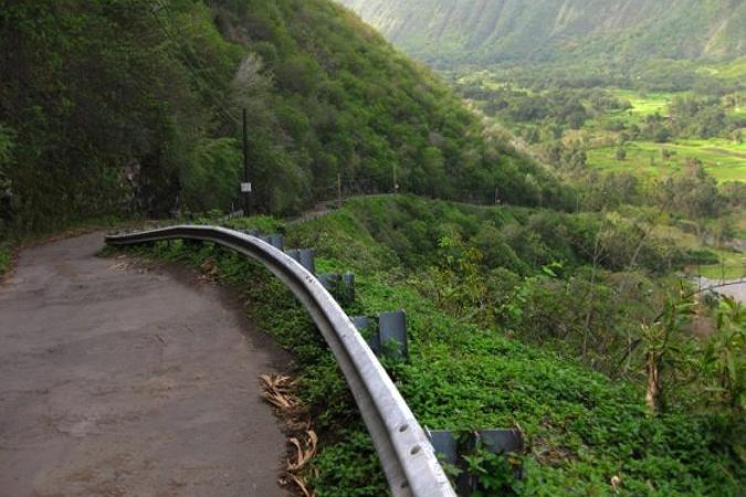 イアオ渓谷の右手の山の岩肌に滝の流れた跡が見える。雨中雨後のみに現れる滝だそうだ。この日は残念ながらその滝を見る事が出来なかった。