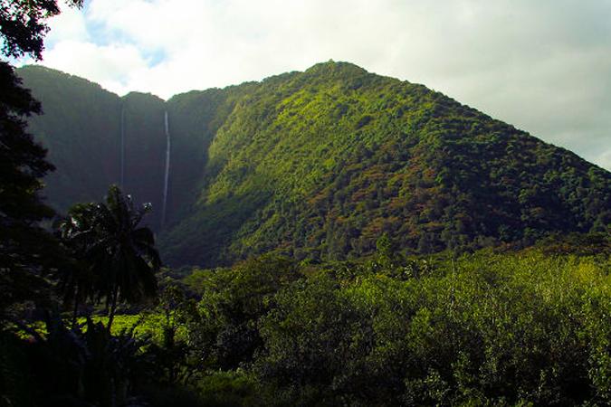 ワイピオ渓谷の奥深くにハワイ島では最高の高さを誇る滝が見えて来ました。 -