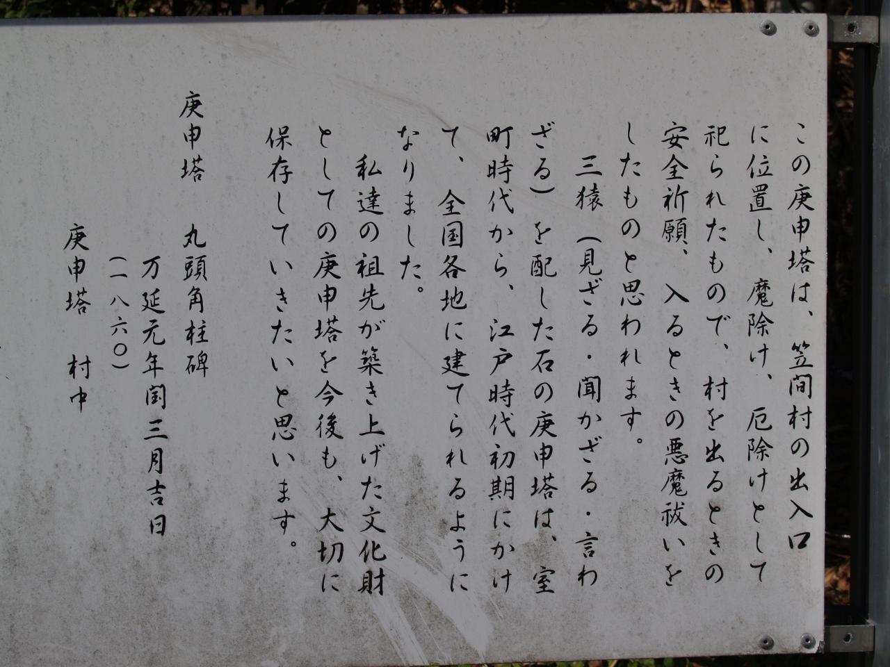 「この庚申塔は、笠間村の出入口に位置し、魔除け、厄除けとして祀られたもので、村を出るときの安全祈願、入るときの悪魔祓いをしたものとおもわれます。