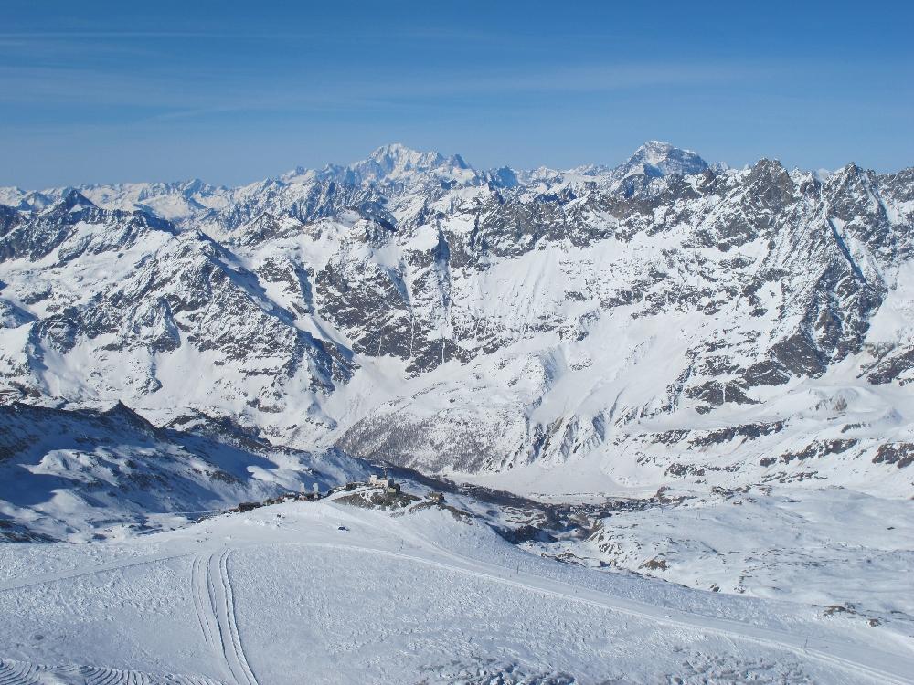 二日目(2月27日)は、クラインマッターホルンまで上った後、イタリア側のチェルヴィニアまで国境を越えて滑走。写真は、クラインマッターホルン展望台から見たイタリア側。写真中央やや左下の少し盛り上がったところは、イタリア側からロープウェイで上がる終点のプラトーローザ。その上に遠く見えるのがモンブラン。