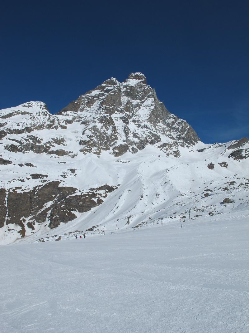 四日目(2月29日)は、スネガエリアを滑走。ツェルマットから地下ケーブルカー、ゴンドラ、ロープウェイを乗り継ぎ、最上部のロートホルンに上る。写真はそこから撮影したマッターホルン。ホテルから見える形とあまり変わらないが、この方向から見る形がもっとも均整が取れて美しいとされている。