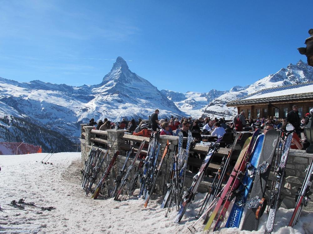 昼食を終えて、リフトに乗りスイスに戻る。二日目も快晴で、冬とは思えない暖かさだ。ゲレンデでは、マッターホルン(チェルヴィーノ)を背にのんびり昼休みをとっている人も多かった。