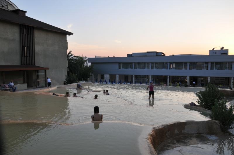おお!露天風呂です。上の噴水から温泉が噴出しているので、下の棚に行くほど温くなります。水着着用で帽子必須とのこと。帽子は2リラでレンタルできますが、当然日本から持ってきています。さっさと荷物を置いて入りましょう。
