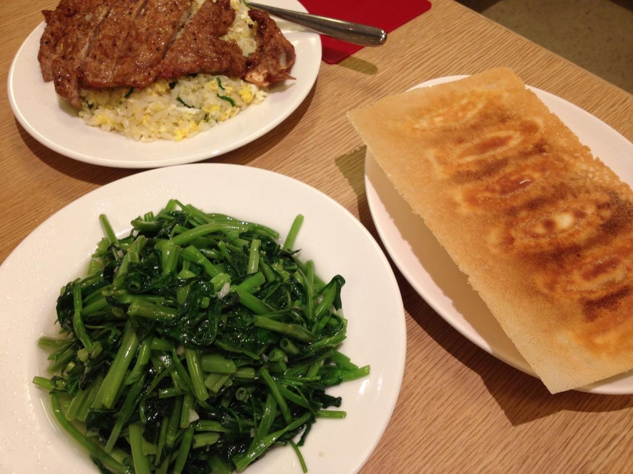 空心菜の炒め物、海老入り焼き餃子、排肉のせチャーハン。