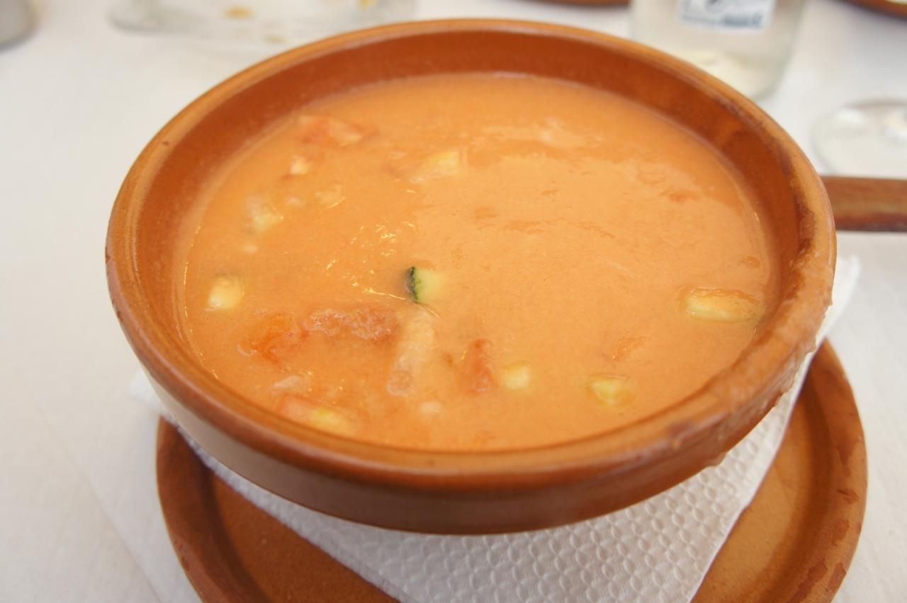 トマト味の冷たいスープに玉ねぎ、きゅうり、トマトなどの具を入れて飲むスープ