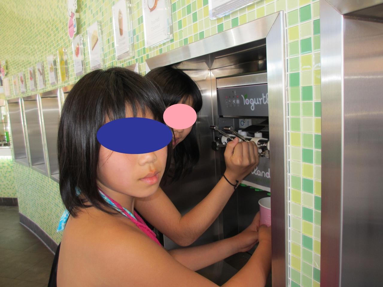 いろんな方の旅行記やブログを見ていて、絶対に行くぞと決めていたよっし〜一家。残念なことにほとんどお腹が空いていなかったので、4人ででかいカップ一つ。かなり迷いながら何とか完成。 後から知ったんですが、テイスティーカップがあって味見をしてから買えるそ〜です。後で知ったのがちょっち残念。