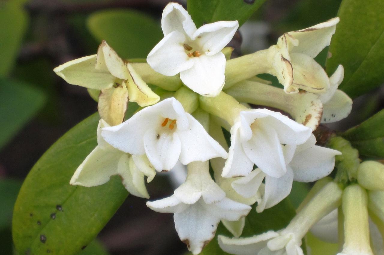 沈丁花の白い花のアップ光景です。近付くと、強い芳香が感じられました。