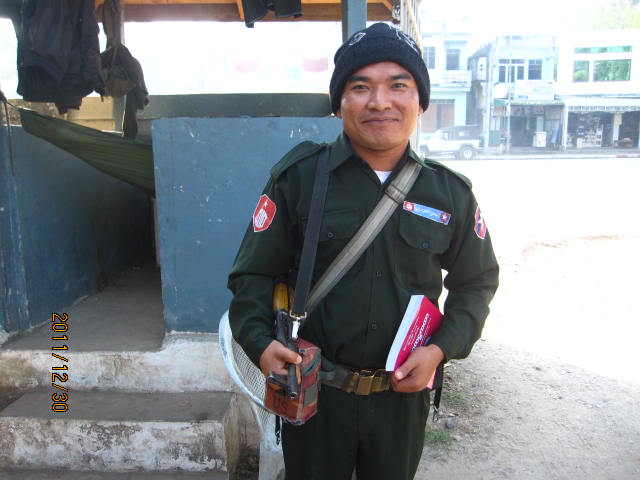 途中には警察署などもあり、カービン銃を抱えた警察官が歩哨に立っていたが、銃が珍しく、当方写真撮影をお願いしたら、気安く応じてくれた。ミャンマーの治安がどうかは知らないが、今でも自動小銃を抱えて警備に当たっているところ見ると、内戦ではないにしても、いつ何時ゲリラの襲撃があるか分からない緊張状態にあるのかも知れない。そんなこんな眺めながら漸くタイレストランに到着した。