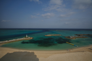 ホテルビーチ遊泳エリア。夏本番でこれだったら干潮時には狭すぎるだろう。