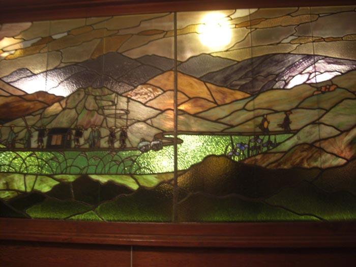 当館の目玉、ステンドグラスでございます。中山道を行く大名行列ですね。