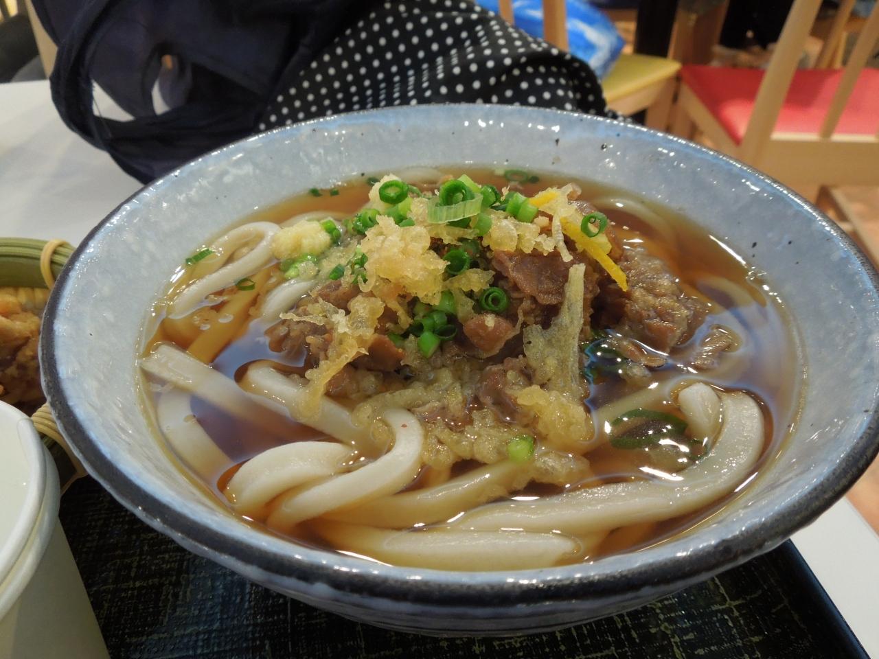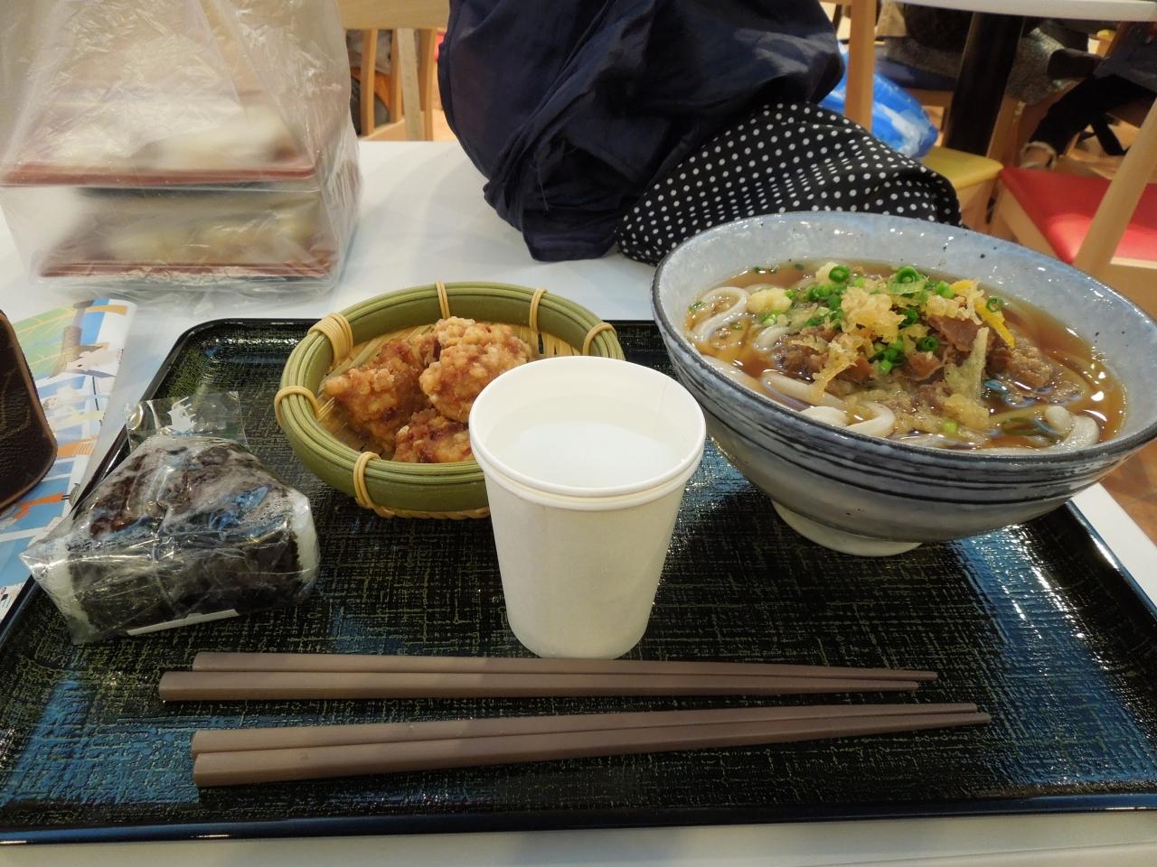 フードコートで注文した、肉うどん・から揚げ・御握りです