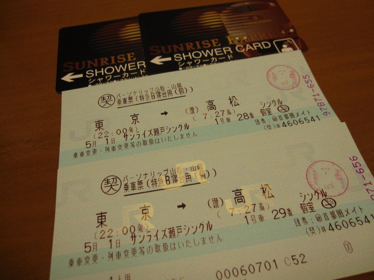 サンライズの乗車券と車掌さんから購入したシャワーカード。